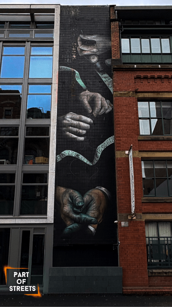 Right next to the Hyuro’s mural is a work by Tankpetrol, a Polish artist who used to live in Manchester. His technique is impressive, whether on large-scale murals or canvas. It combines spray paint and traditional painting with stencil techniques. Although he often portrays women, here in Manchester, he created a mural of A Clockwork Orange author Anthony Burgess.