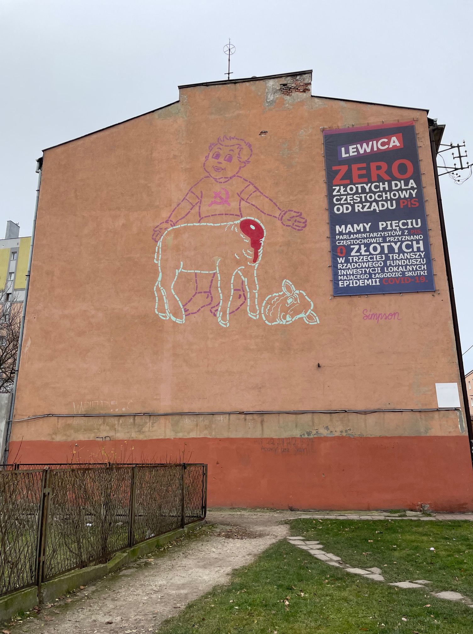 Simpson is known for his art of commenting on the political and social situation. The mural shows a boy dressed in a T-shirt with a sickle and a cross (communism and Christian symbols), standing over a dead lamb. The interpretation is connected with Polish history. When after II World War the communists rule the country, and the catholic church was the opposite.