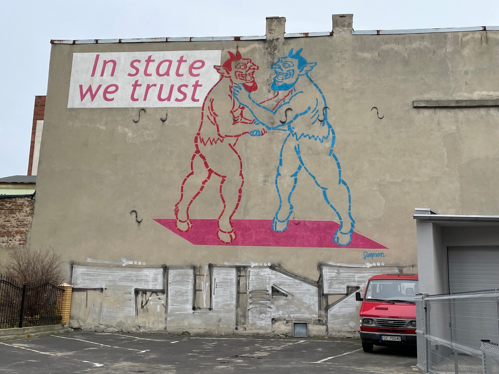 Two fighting devils are Simpson’s second political mural in Częstochowa. The devils fight with one hand and the other is in a shakehand. According to the author, it symbolizes the rivalry and making pacts between political fractions. The mural is located near an orthodox church and an evangelical church, which may be ironic.