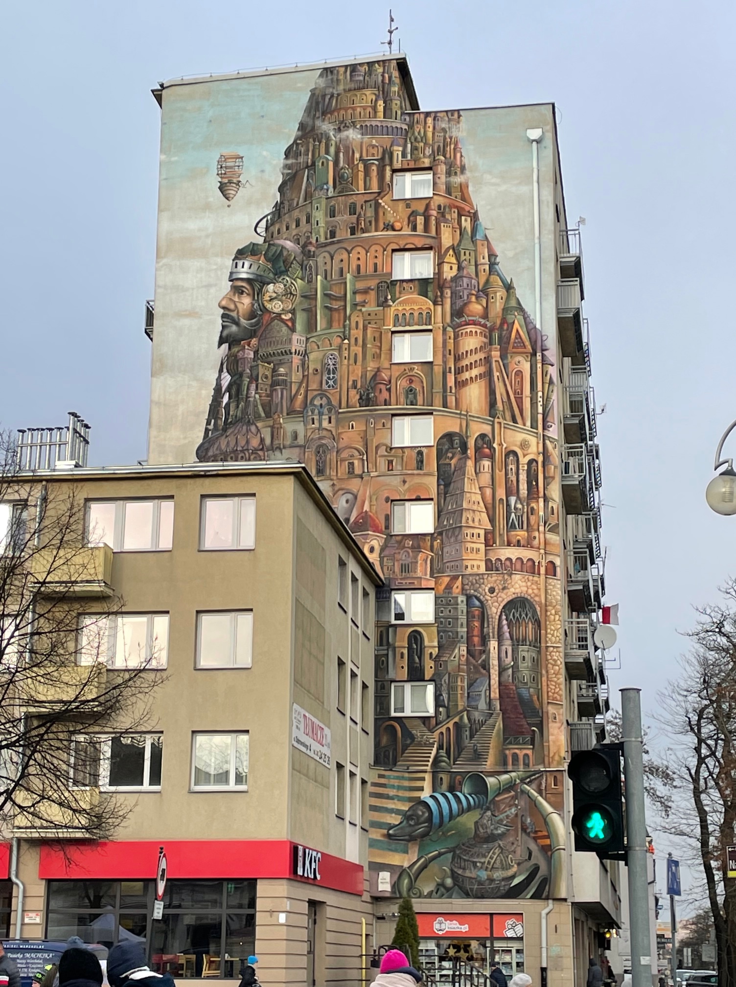 This huge piece of art was created because of Stefan Rybicki, the local clockmaker who sponsored the mural. The mural’s author, Tomasz Sętowski, is one of the greatest artists in Częstochowa. I recommend that you look carefully at the painting and pay special attention to how the balconies and windows are inscribed in the mural as well as other unique details in it.
