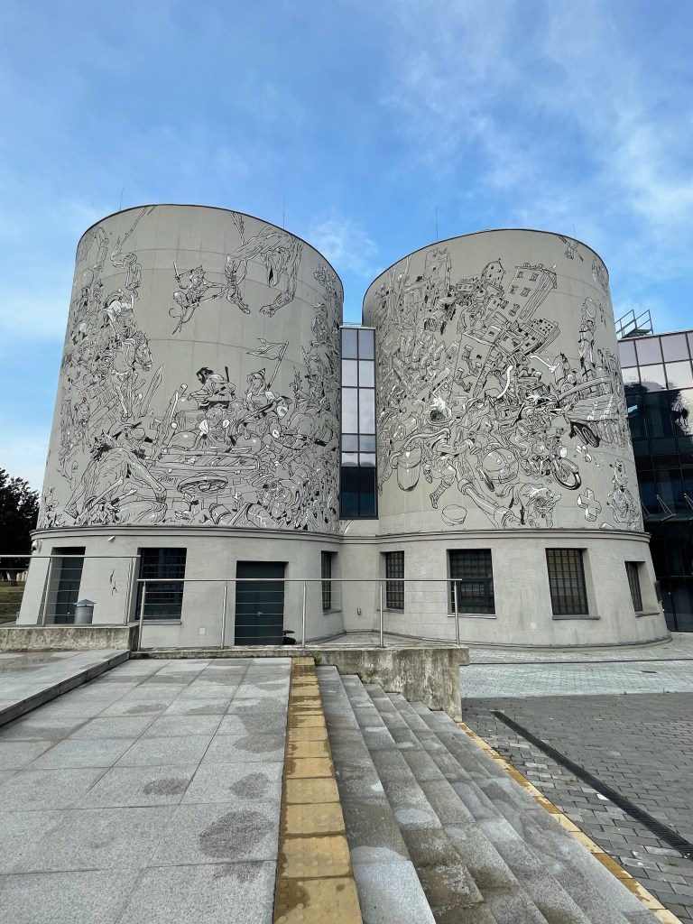 The last mural on our tour is unique because of its location. The work is based on a design by Kim Jung Gi – a graphic artist and comic book illustrator known worldwide for his talent and precision. He designed a story specifically for the EC1 Comics and Interactive Narration Center, which was written on the cooling tower buildings. The story begins at the entrance to CKNI. To learn the whole story, head to the left, going around both buildings.