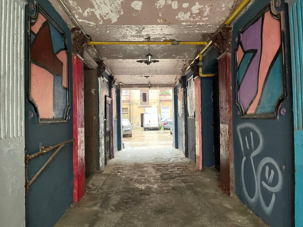 It’s not quite a courtyard, but more like a gate. The artists tried to make the old building pretty. They used the elements of the gate and created a colorful gallery. Besides that, at the front of the building, you can find the Polish word “OPÓR” which means RESISTANCE. Against what? The courtyard is in a bad condition, just like everything else here, so maybe the gate fights against it?