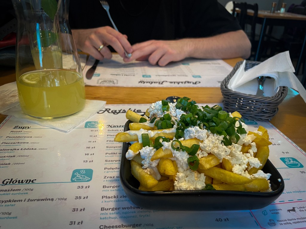 My latest discovery. A really nice place close to Manufaktura. Here you can get vegetarian Polish soups and fries inspired by local cuisine. I tried their fries with cottage cheese. 🙂