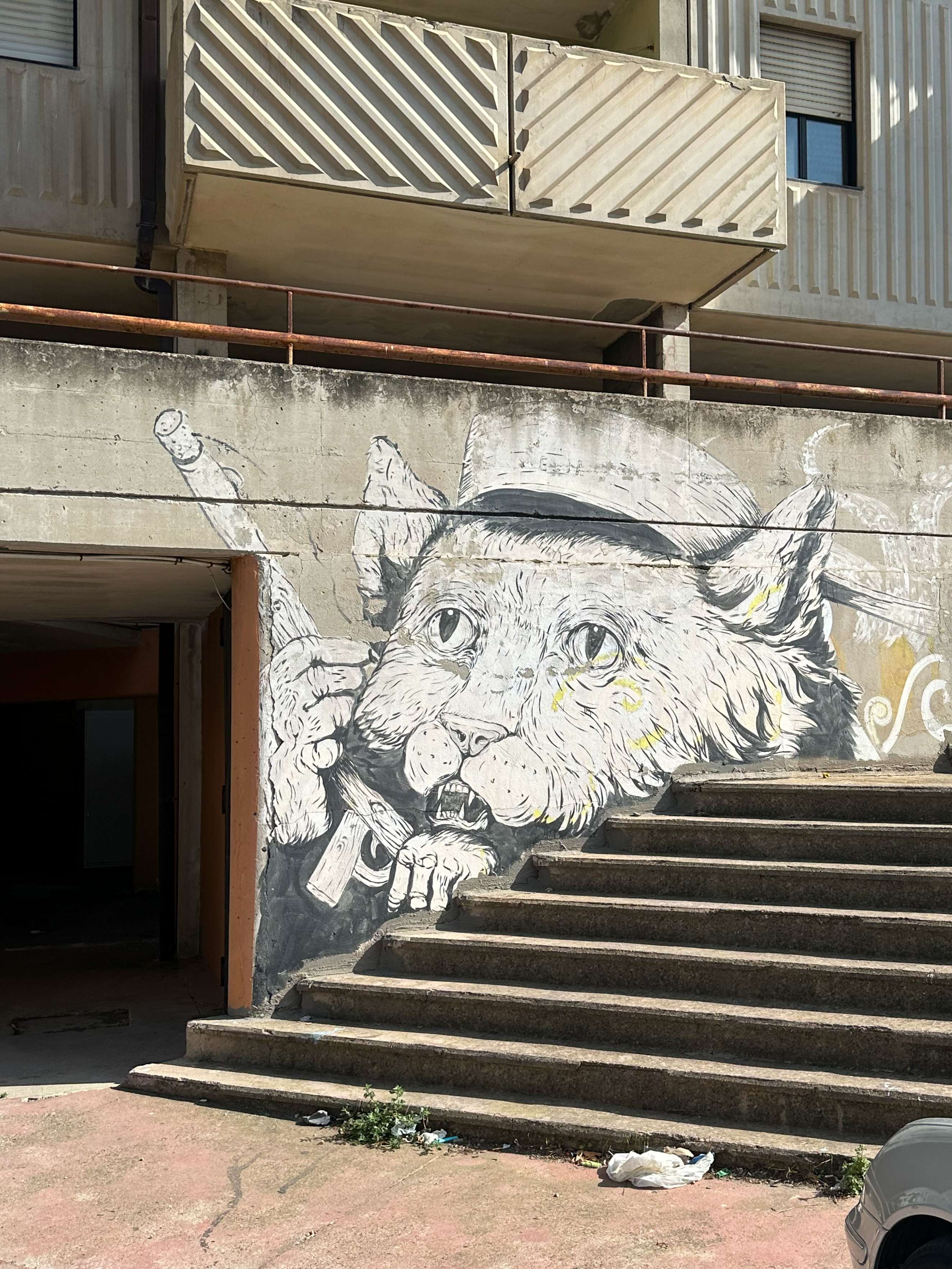 My companion and I also wanted to see something outside the city. The options for exploring the art besides Cagliari (even without a car) are a few. Some of them are easy to achieve, but some need a bit more energy and time. We decided to take a trip to San Gavino Monreale. We hit the jackpot! The city is not too big but there are more than 70 murals by excellent artists – local and foreign. The reason for this is the activity of the SKIZZO Cultural Association. In their office, you’ll get a map of the murals and buy some local merchandise. They also offer guided tours around their town!