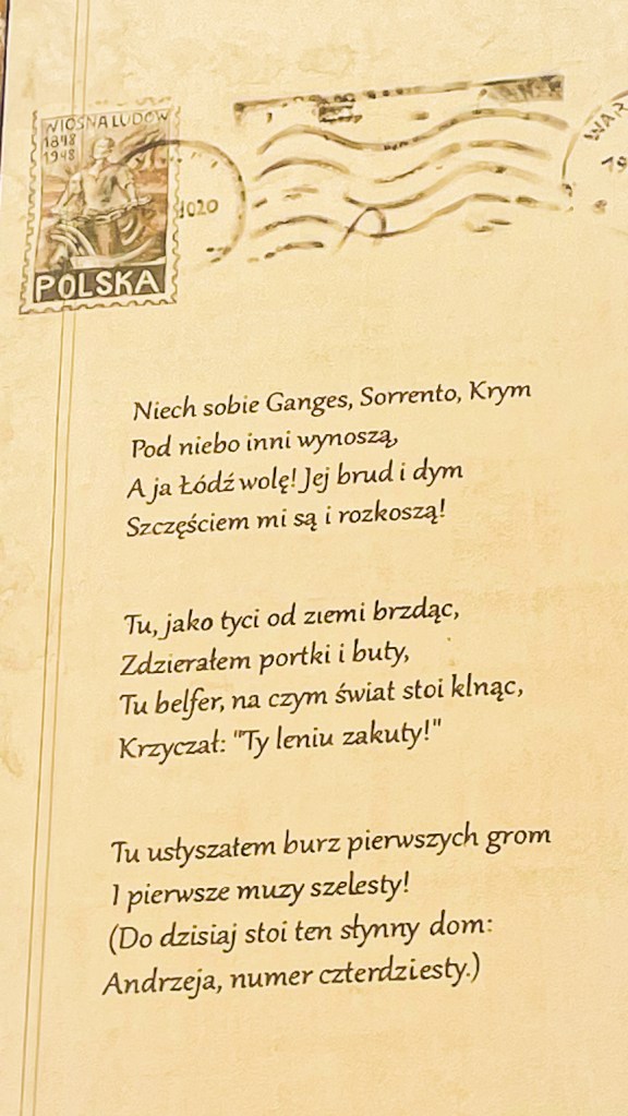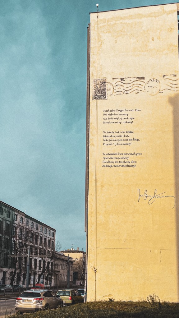 The mural depicts a fragment of a poem by Julian Tuwim, who spent his early years in Lodz.