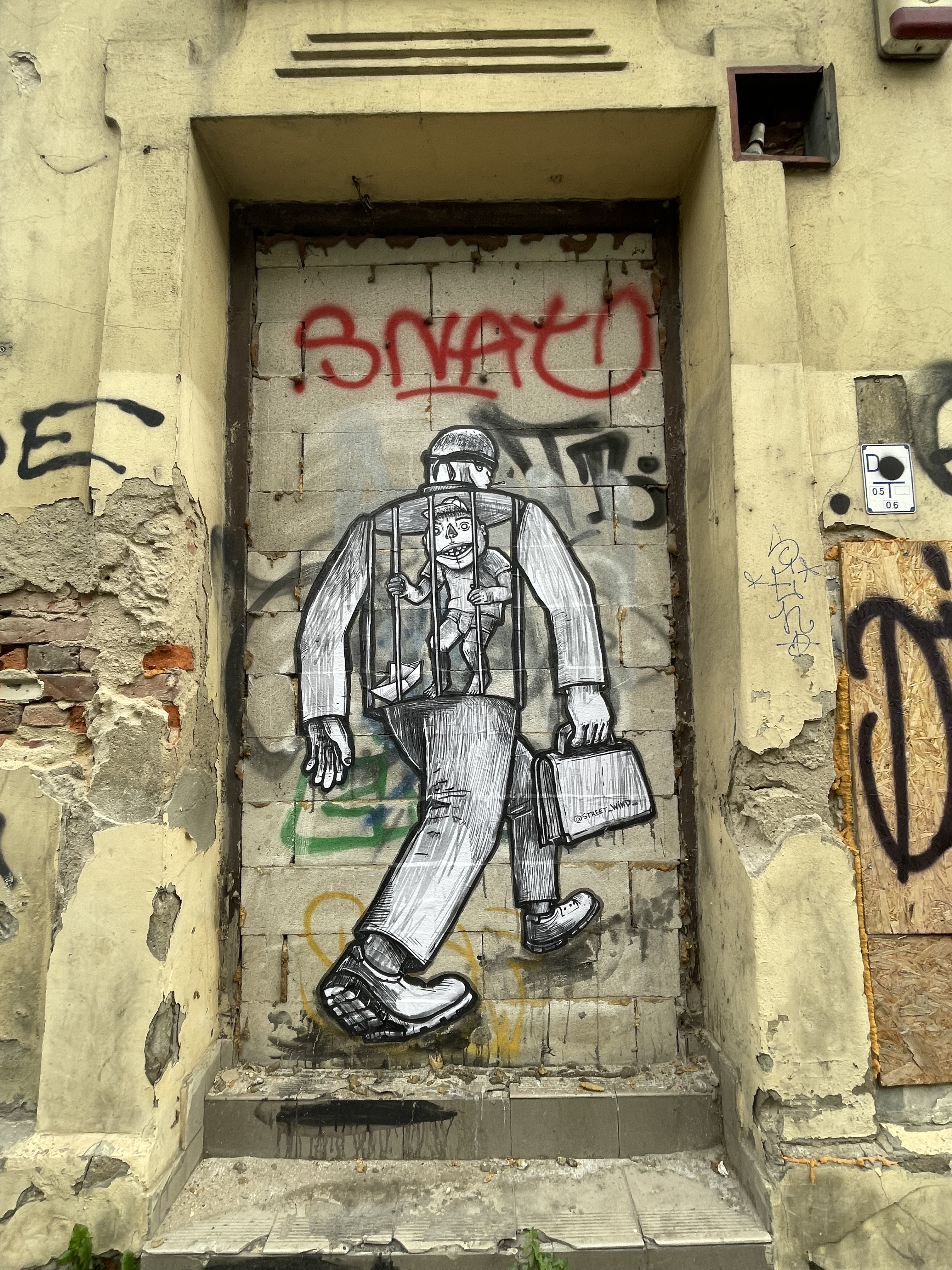 Time for the most touristy street in Łódź — Piotrkowska. Luckily, most murals are hidden away in the courtyards rather than right on the main strip. There are actually so many of them that I ended up making a separate post just about that.
