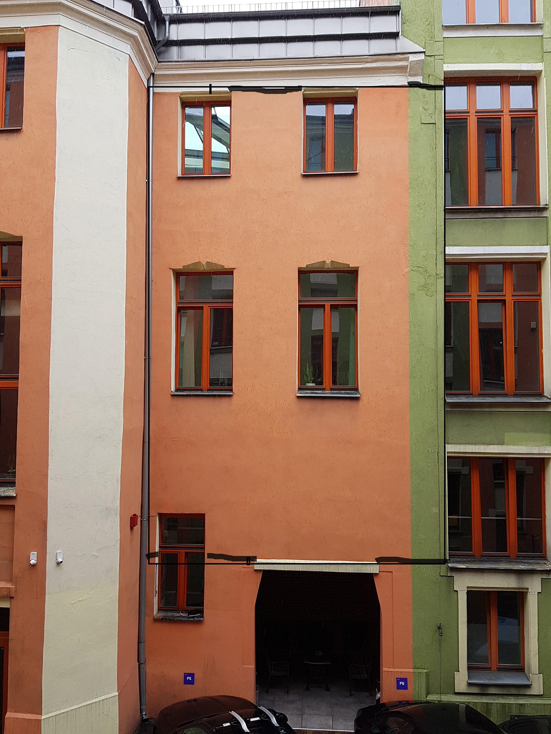 This courtyard hides two artworks. The first, created by the Wallart group, stands out because of how… unnoticeable it is. Their mural cleverly imitates balconies. It’s doing it surprisingly well.