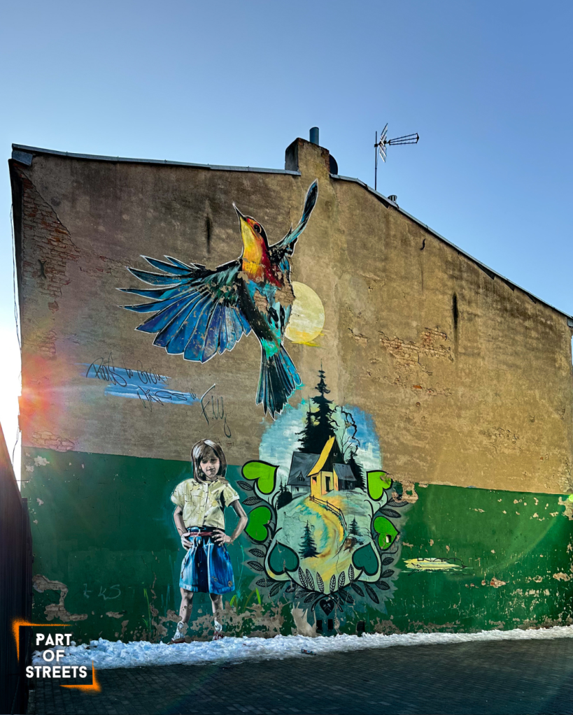This is one of those streets in Łódź where you’ll find well-known names from the street art scene right next to each other. It’s a really pleasant place to walk. The street has been revitalised, there aren’t many cars around, and the vibe is just right. I’d recommend switching into an attentive observer mode while exploring it and not rushing at all. Every mural here deserves plenty of attention!